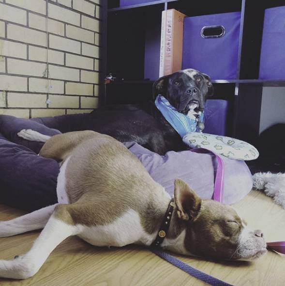 Sally’s big smile is heart melting, as are the face kisses that always follow. She may seem small, but her tail wagging is known to become a full body wiggle, making her the bull of this china shop. If she’s not visiting with you, Sally is probably spooning her best friend Sparky, a one-year old pup who is completely fine being carried around the shop like a big baby. When you look as cute as these two, sometimes you can overlook the sleeping on the job.